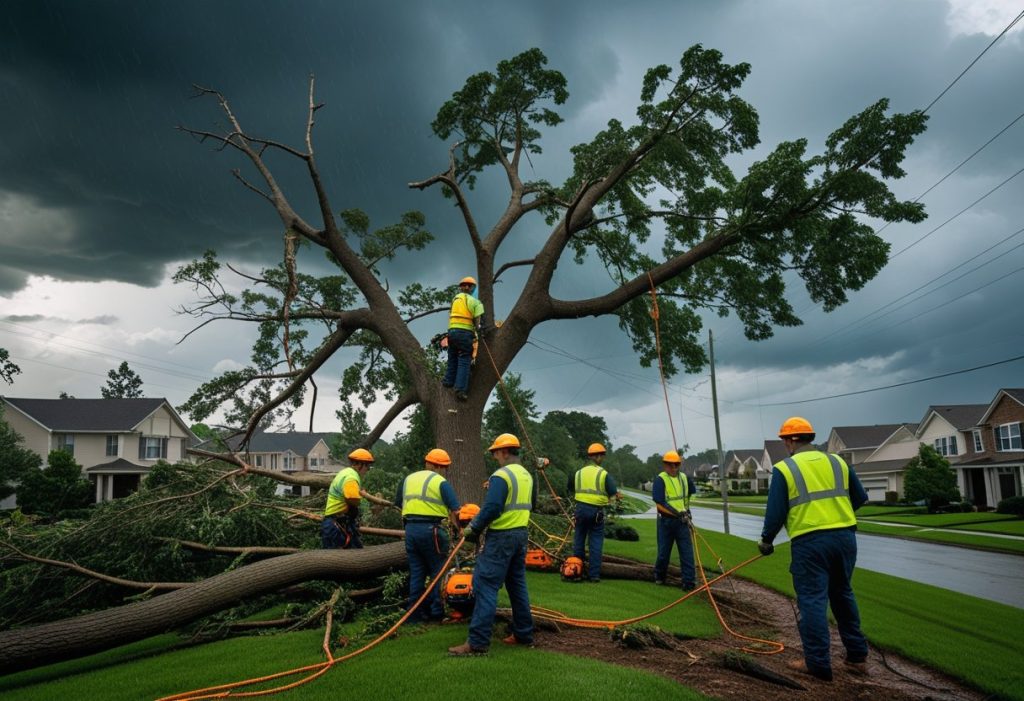 Storm cleanup tree service means removing broken branches, fallen trees, and debris after storms.
